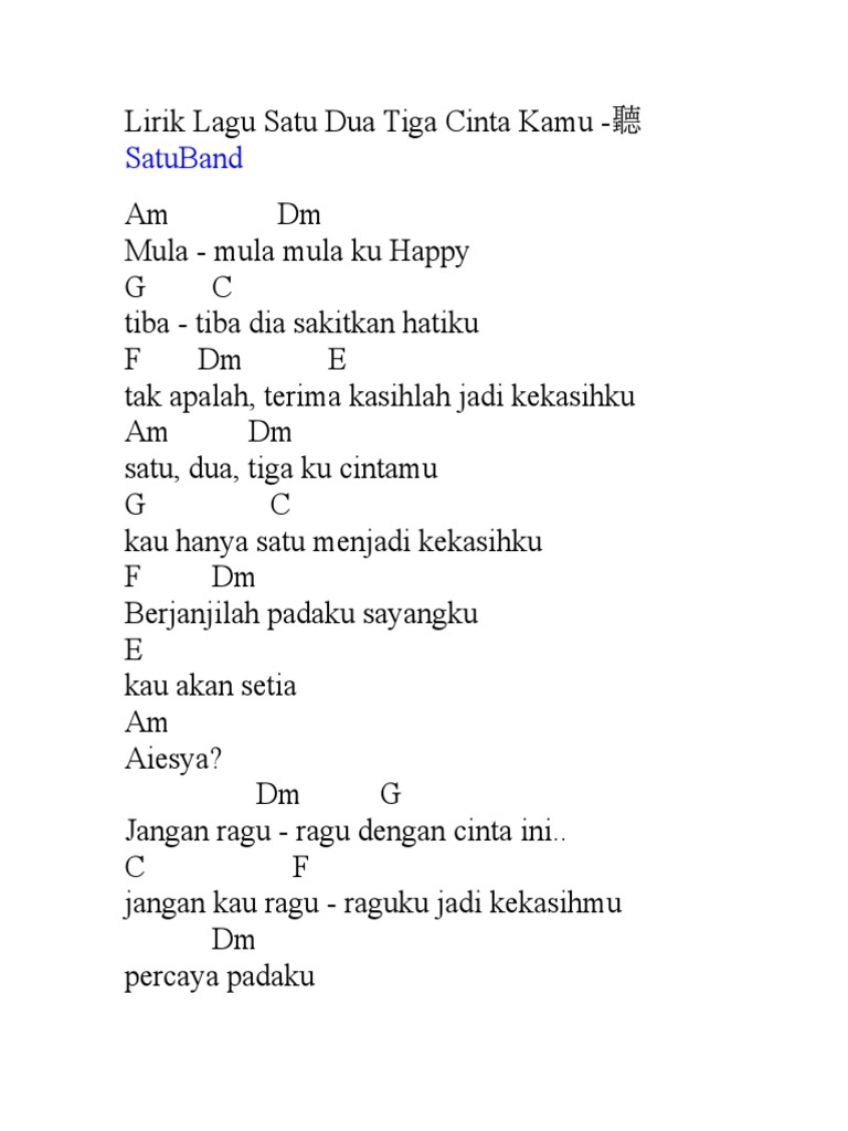 Sekarang jari manis ada 6 karat. Satu Dua tiga ku cintamu Kau Hanya satu menjadi kekasihku Berjanjilah Padaku sayangku Kau Akan setia. Mula mula mula ku happy tiba tiba dia sakitkan hatiku tak apalah terima kasihlah jadi kekasihku satu dua tiga ku cintamu kau hanya satu menjadi kekasihku berjanjilah padaku sayangku kau akan setia aisyah jangan ragu-ragu dengan cinta ini jangan kau ragu-ragu ku jadi kekasihmu percaya padaku ku akan jadi yang terbaik untuk cintamu aisyah.
